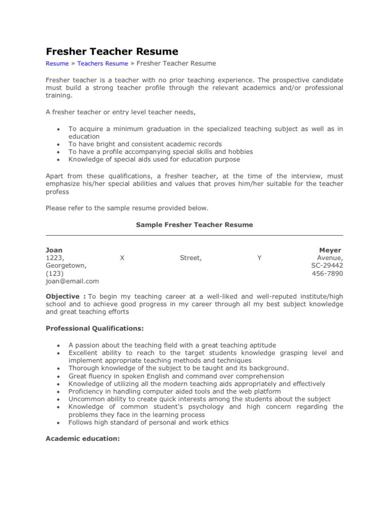 Fresher Teacher Resume Teachers Reading Comprehension