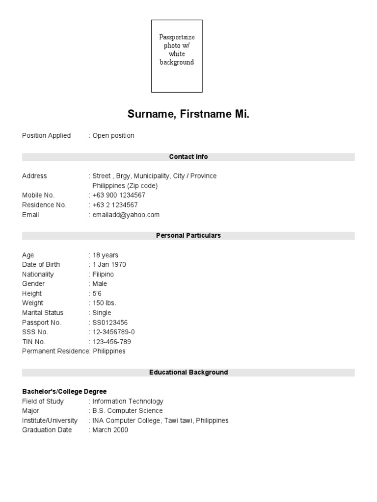 Sample Of Resume Format Philippines Sample Resume Format For Fresh