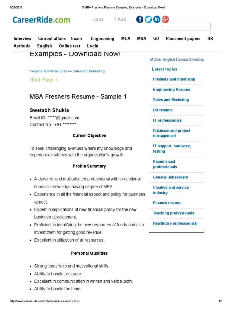 5 Mba Freshers Resume Samples Examples Download Now Pdf
