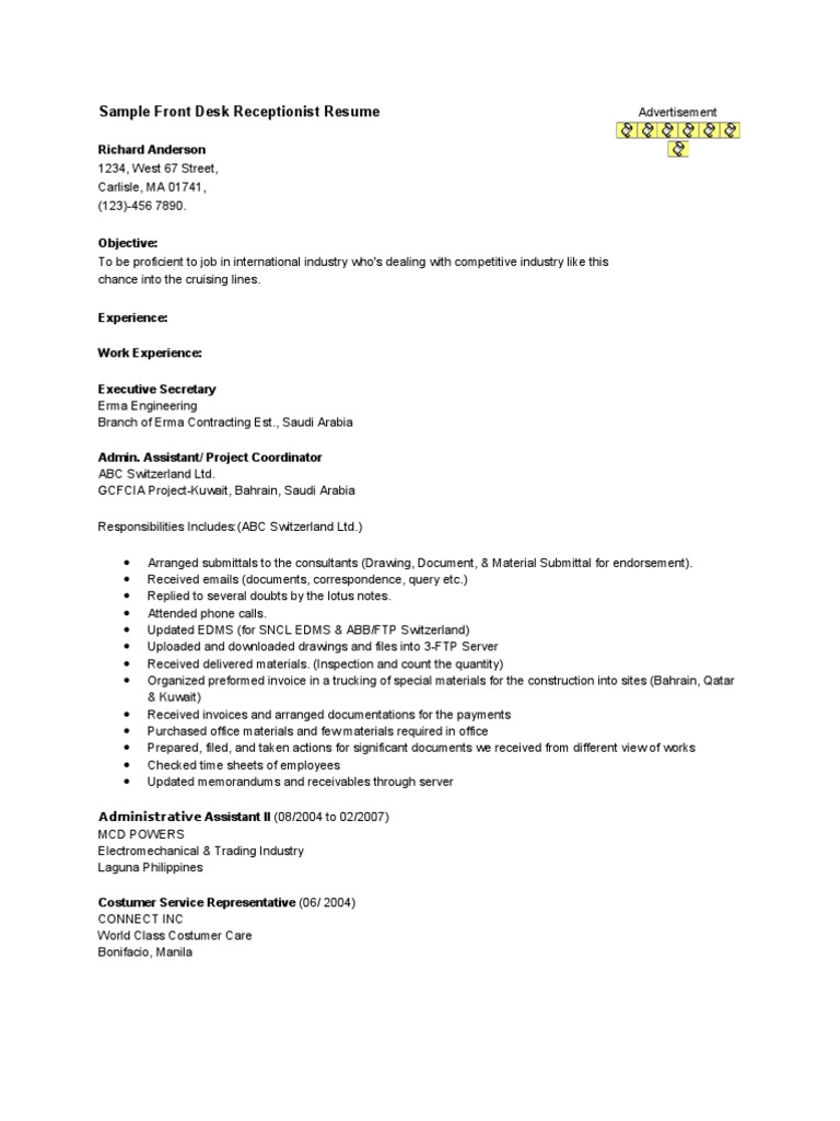 Front Desk Receptionist Resume Front Desk Receptionist Job