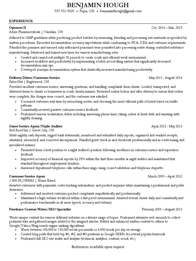Experience Operator Ii References Available Upon Request Search