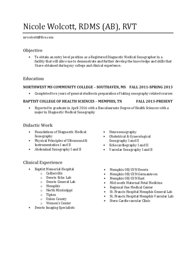 Nicole Wolcott Resume Medical Ultrasound Echocardiography
