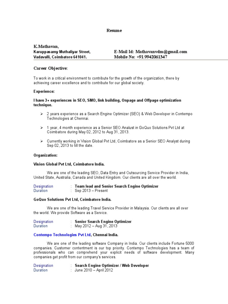 Mathavan Senior Seo Analyst Resume 3 Years Experience Search