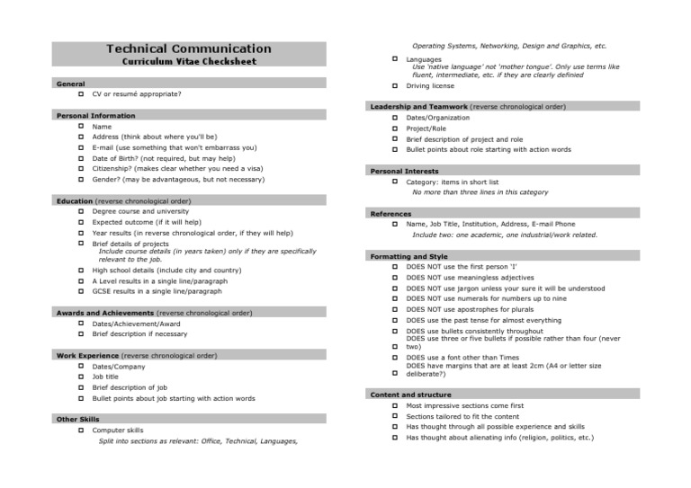 Technical Communication Curriculum Vitae Checksheet Resume