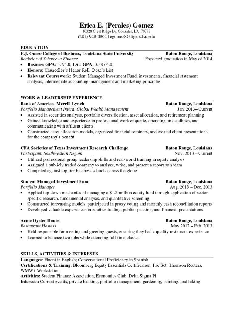 Student Resume Perales Investment Management Investing