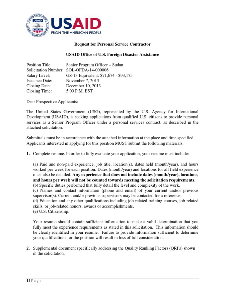 Usaid Ofda Sudan Senior Program Officer Solicitation United